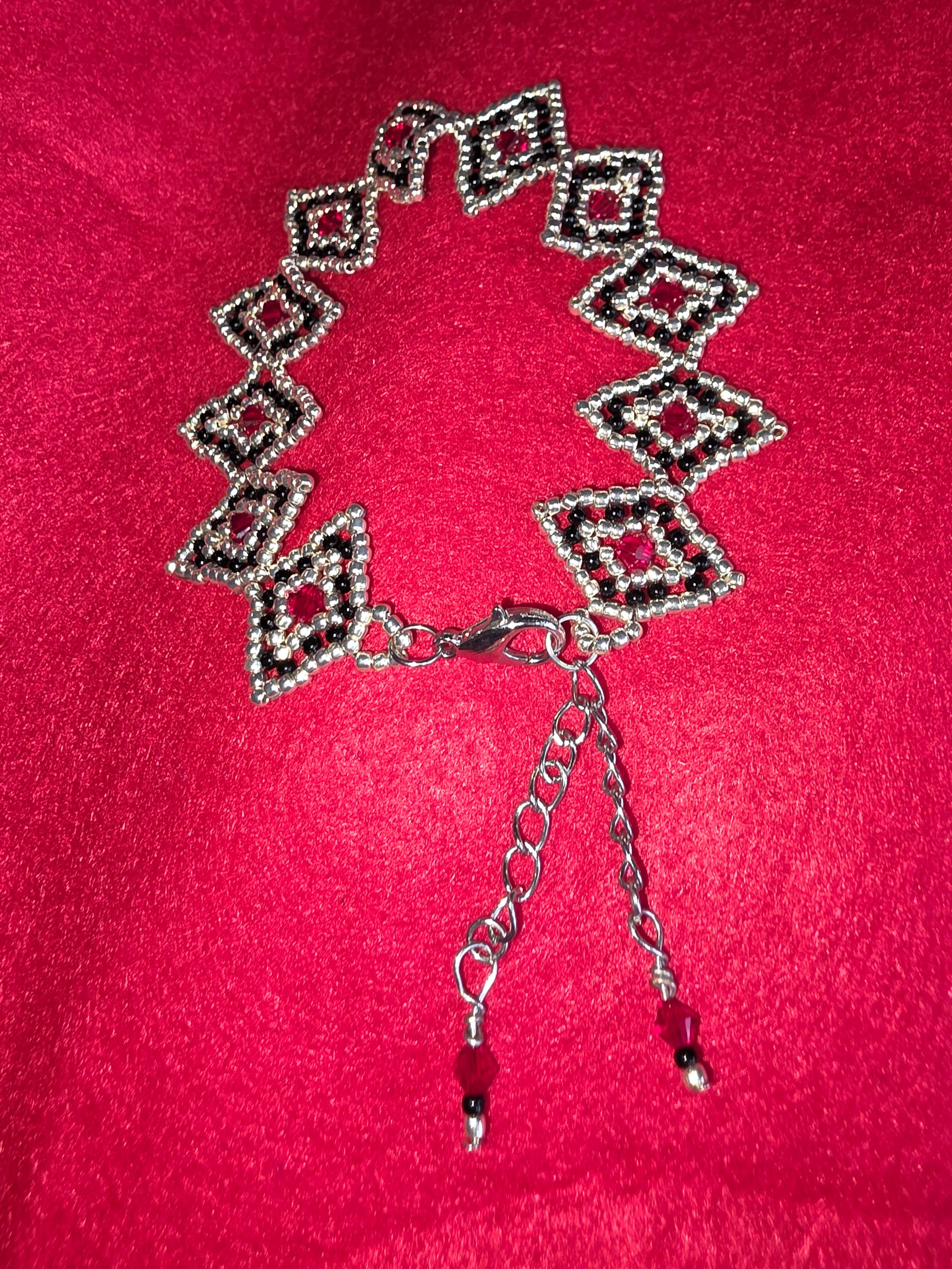 Turn heads with this stunning handcrafted bracelet, woven in a dramatic diamond pattern using shimmering black, silver, and deep red beads. Each diamond is centered with a radiant red crystal, adding vibrant sparkle and striking contrast against the metallic and dark tones. A silver-tone lobster clasp and adjustable chain ensure a comfortable fit, while two red crystal dangles at the end. size 7-8